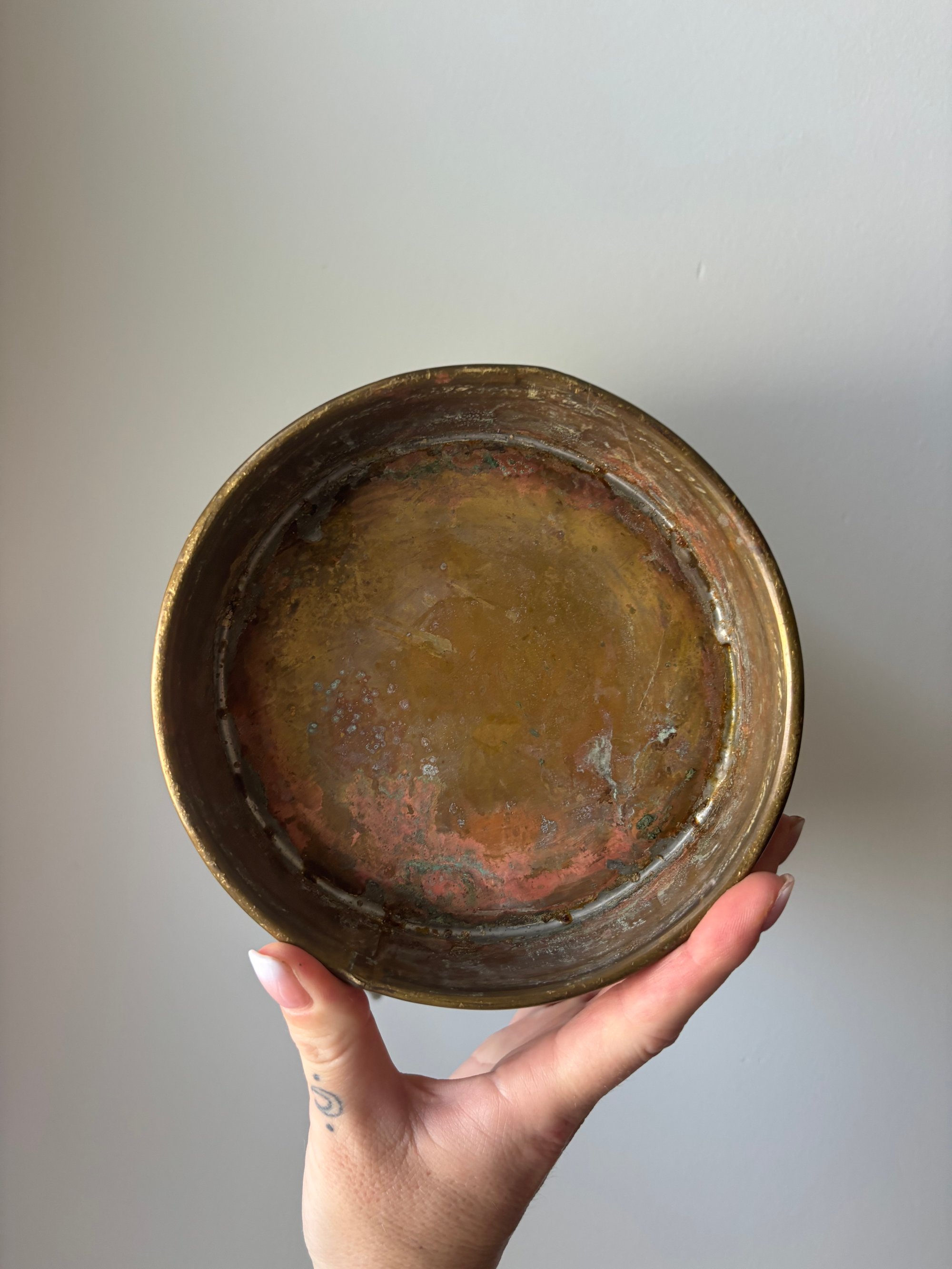 Antique brass milk jug | hand hammered | estimated to be from the early 1900’s | Approx 14.5” X 11” | patina present |