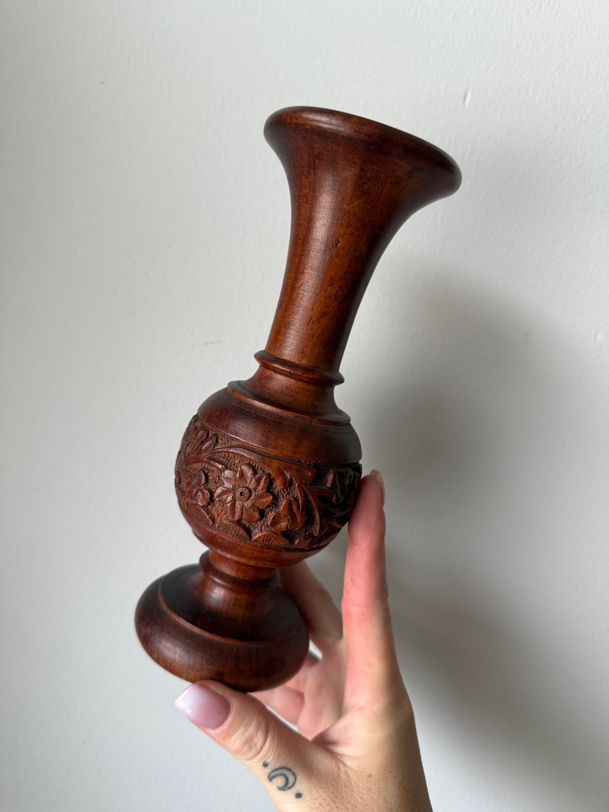 Pair of vintage hand carved wooden vases | can also be used as tapered candle stems | approx 8” tall | rich brown finish perfect for fall | 🍂 Pair for $28 |