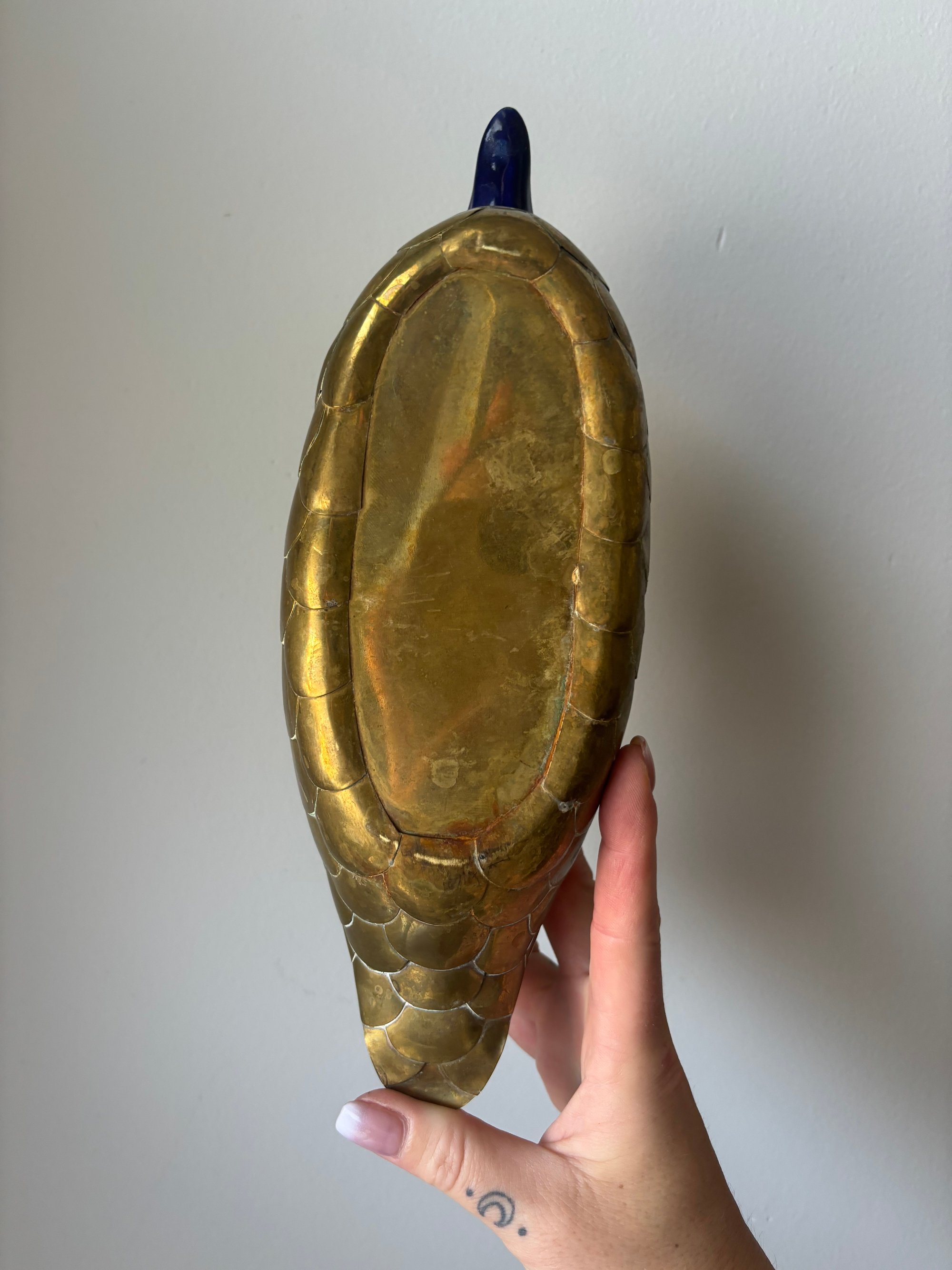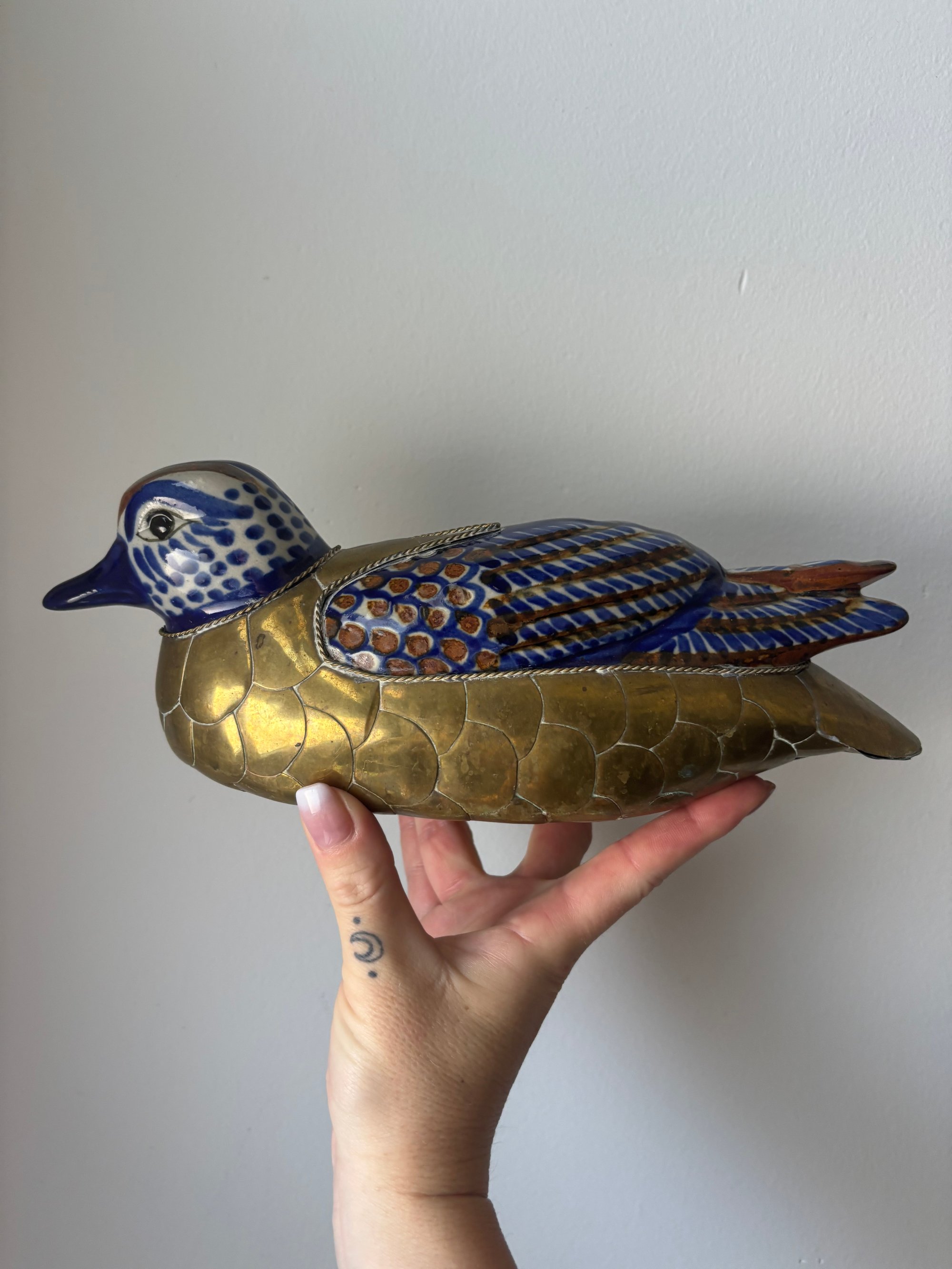 Vintage Tonala brass & ceramic hand painted mosaic duck | patina present | approx 11.5” x 4” | 🦆